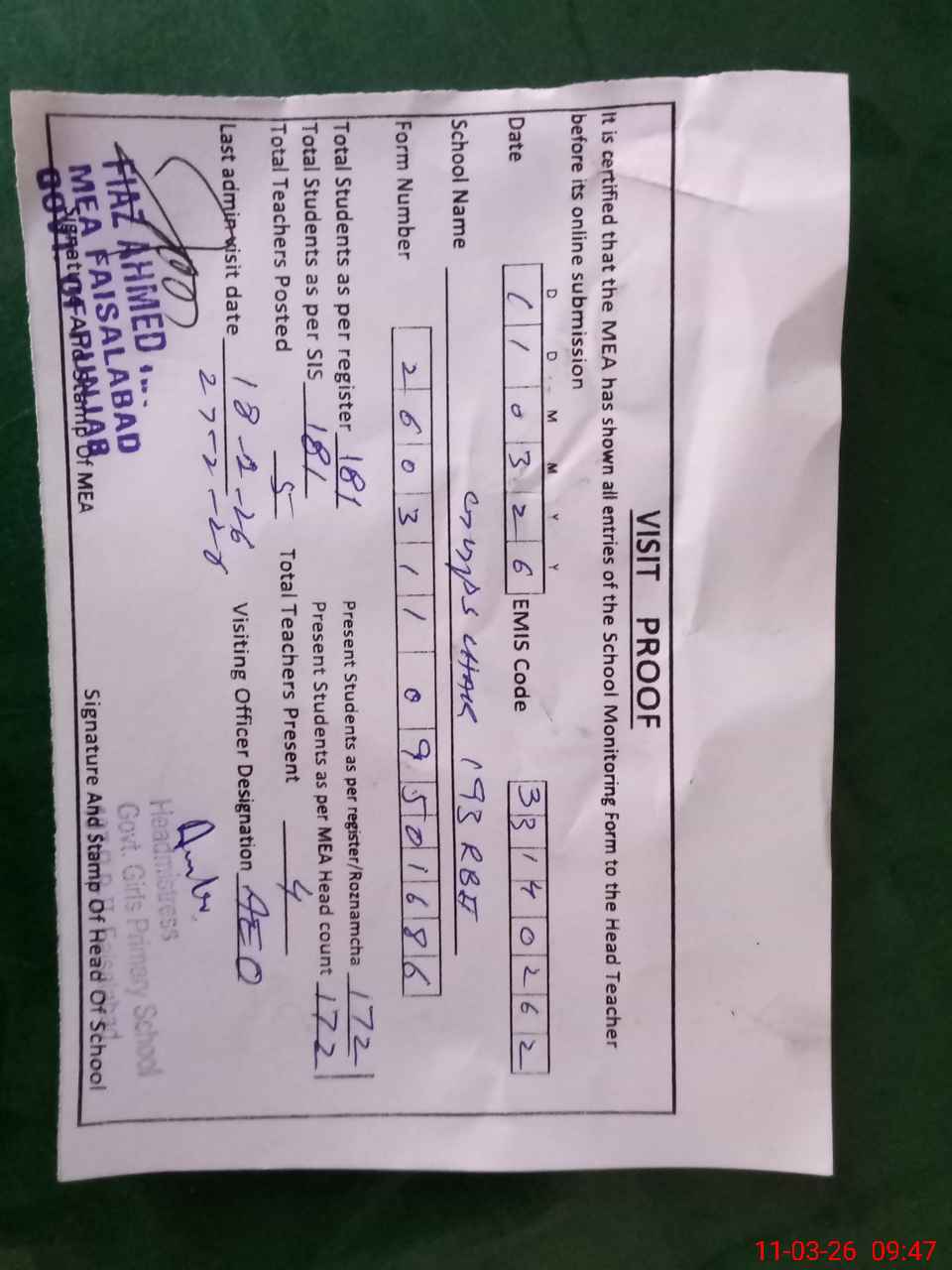 | Attendance Register | Head Teacher | MEA with School | Visit Proof |