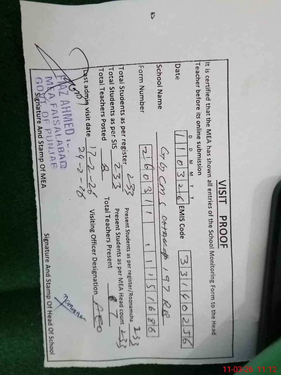 | Attendance Register | Head Teacher | MEA with School | Visit Proof |