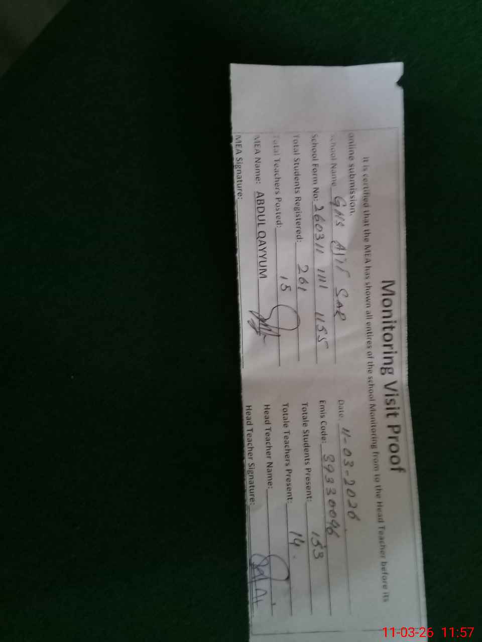 | Attendance Register | Head Teacher | MEA with School | Visit Proof |