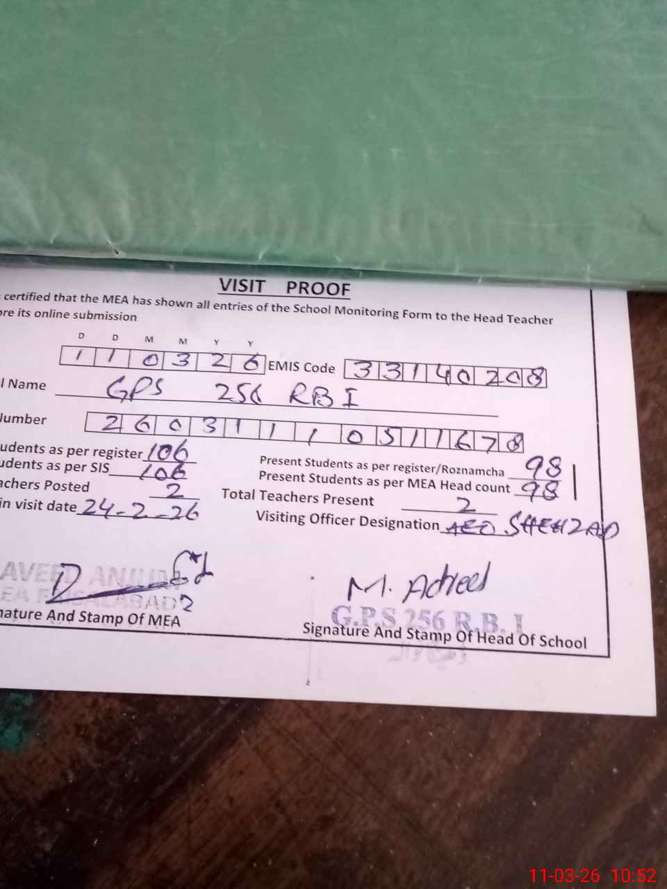 | Attendance Register | Head Teacher | MEA with School | Visit Proof |