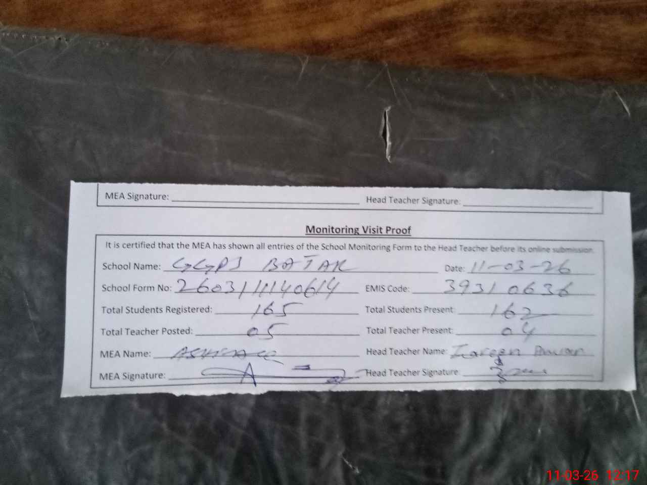 | Attendance Register | Head Teacher | MEA with School | Visit Proof |