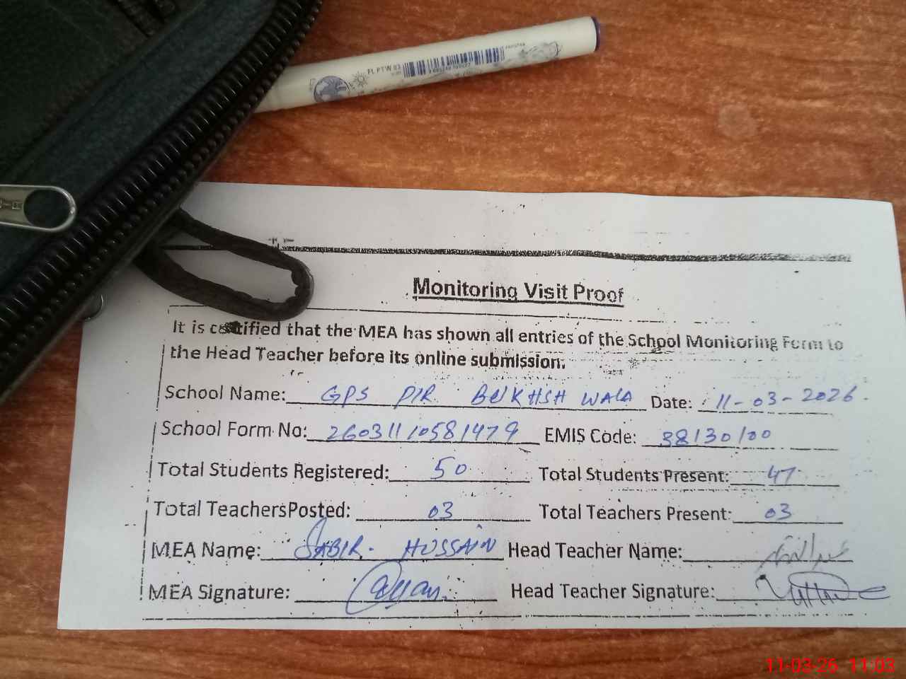 | Attendance Register | Head Teacher | MEA with School | Visit Proof |
