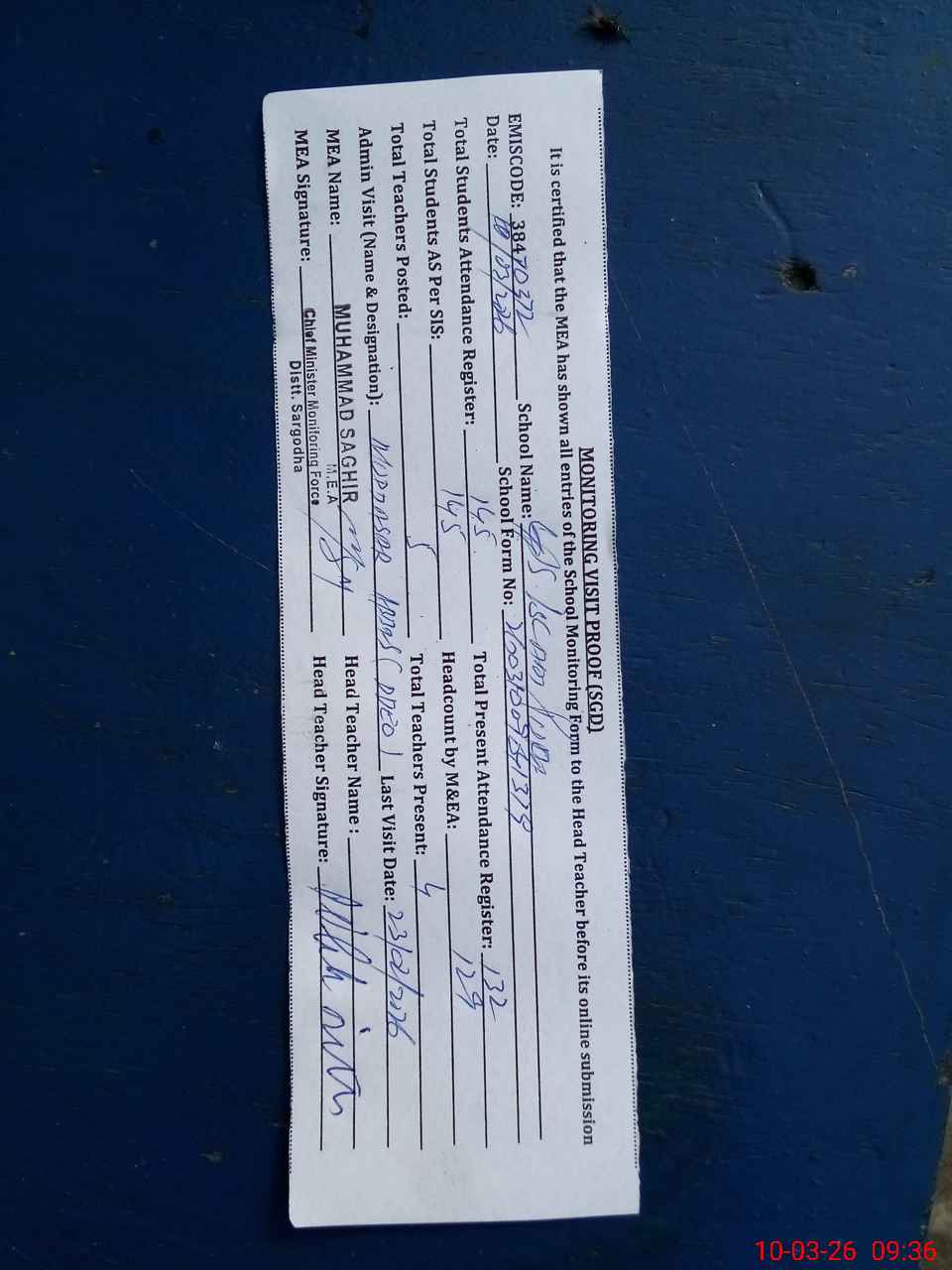 | Attendance Register | Head Teacher | MEA with School | Visit Proof |