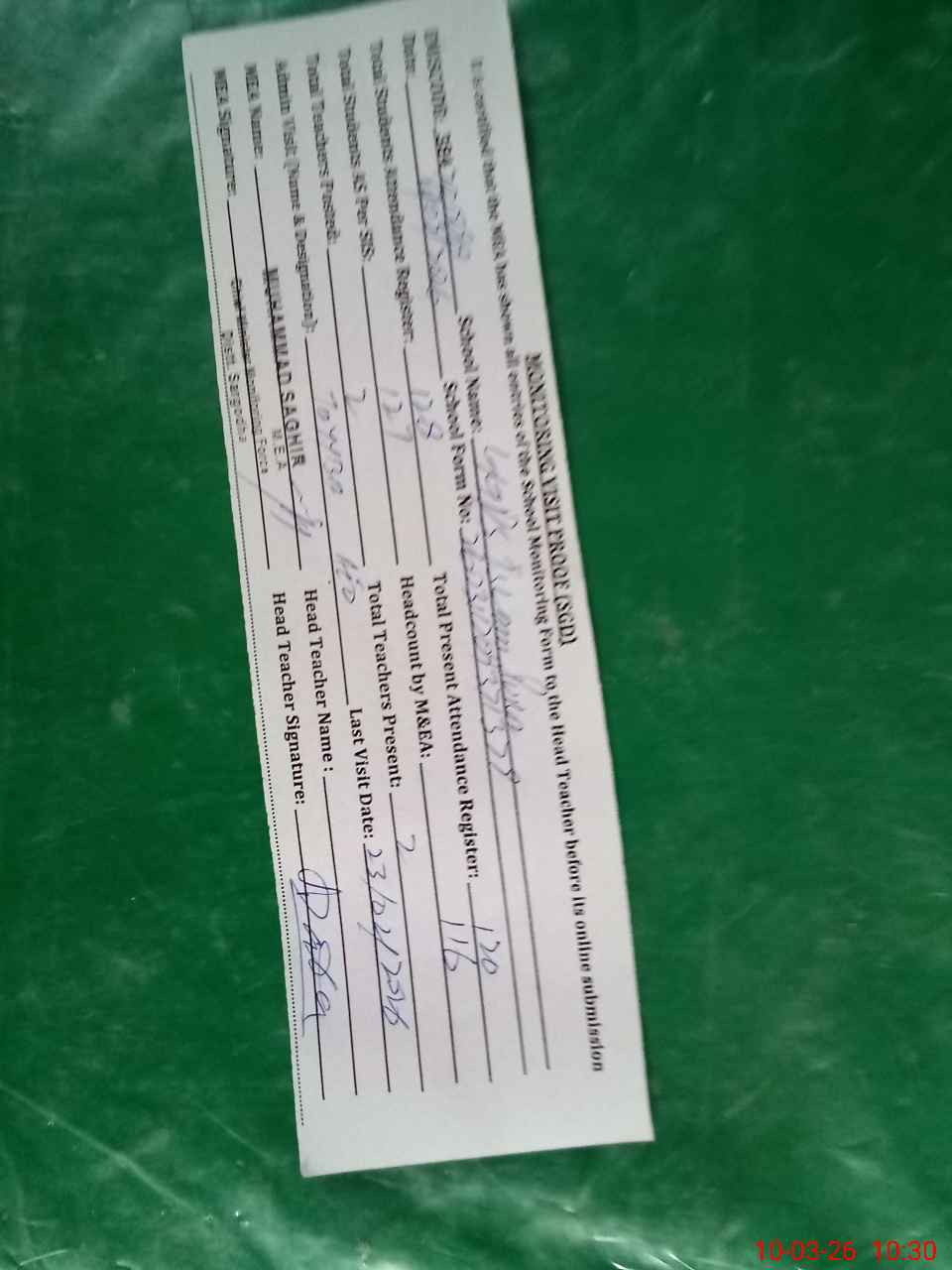 | Attendance Register | Head Teacher | MEA with School | Visit Proof |