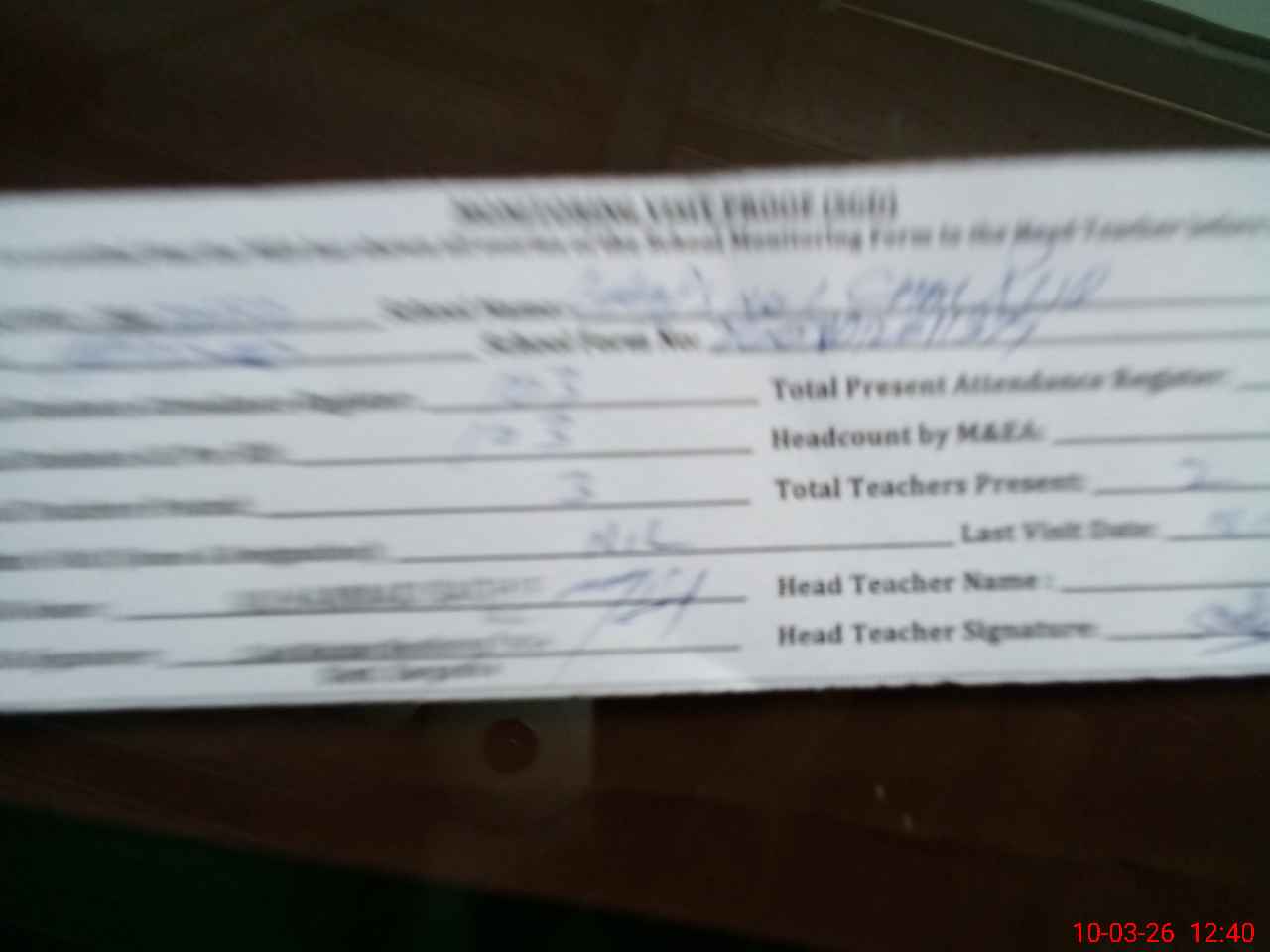 | Attendance Register | Head Teacher | MEA with School | Visit Proof |