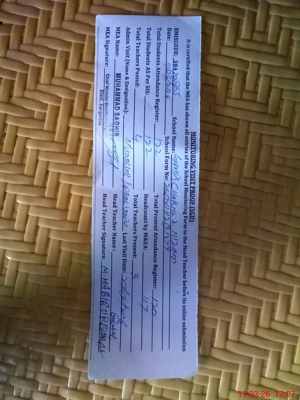 | Attendance Register | Head Teacher | MEA with School | Visit Proof |