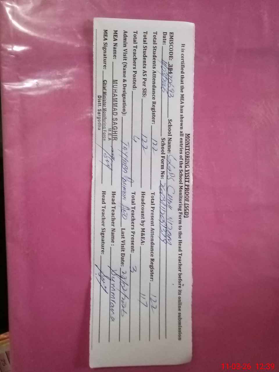 | Attendance Register | Head Teacher | MEA with School | Visit Proof |