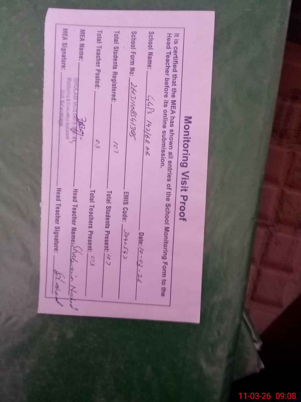 | Attendance Register | Head Teacher | MEA with School | Visit Proof |