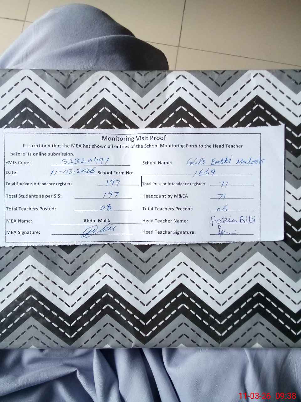 | Attendance Register | Head Teacher | MEA with School | Visit Proof |