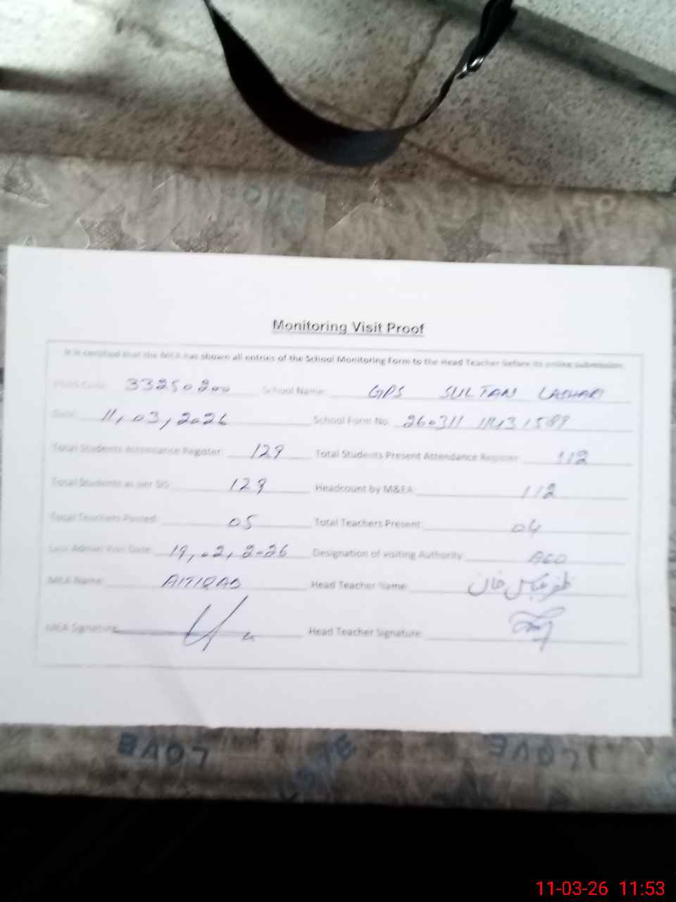 | Attendance Register | Head Teacher | MEA with School | Visit Proof |