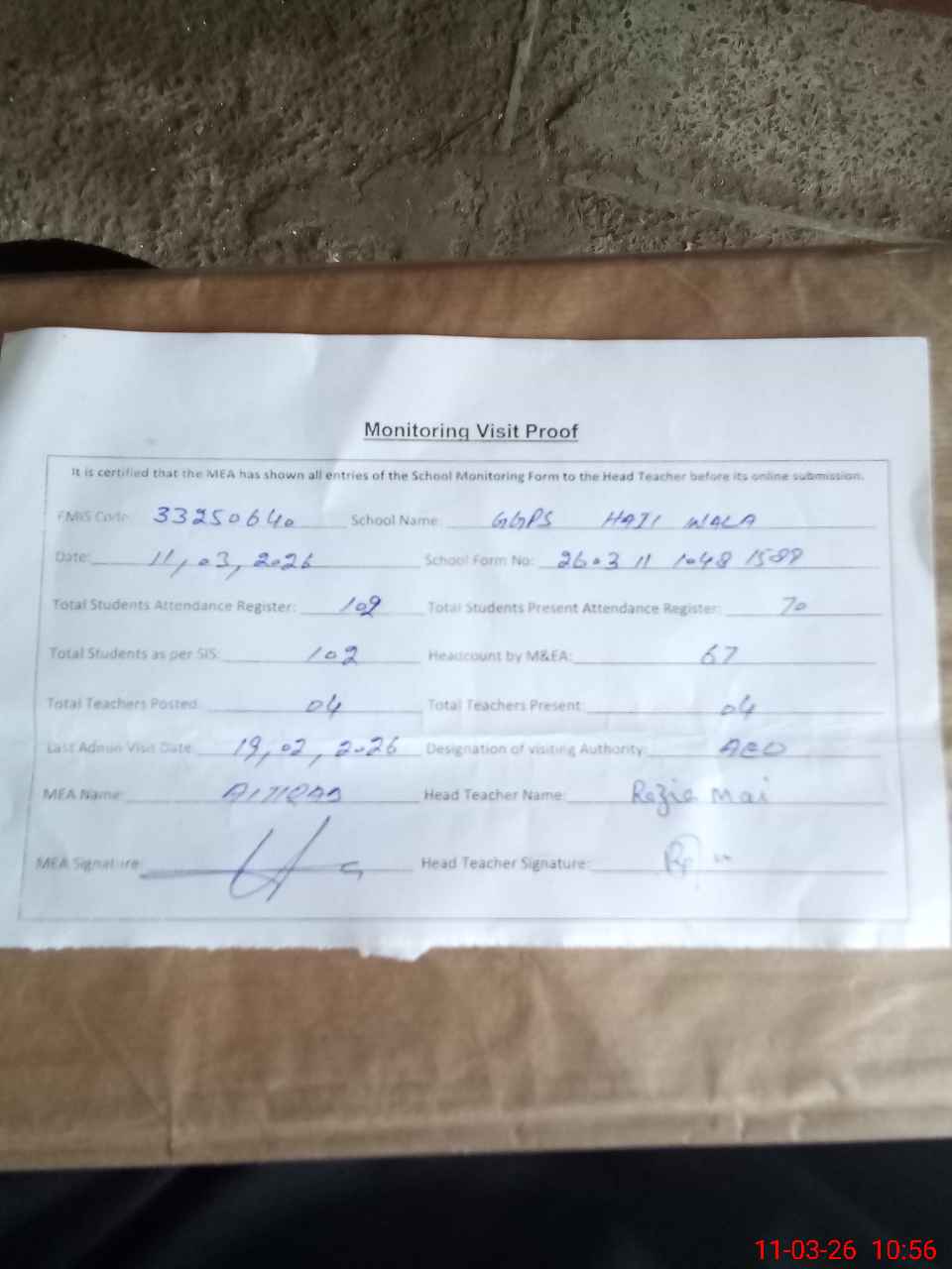 | Attendance Register | Head Teacher | MEA with School | Visit Proof |