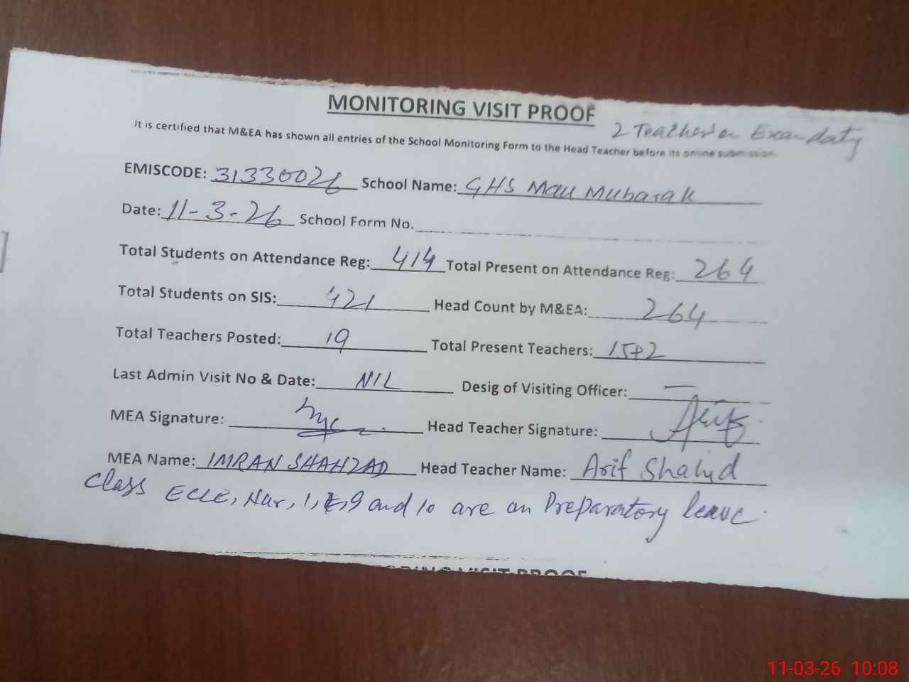 | EMIS Code: 31330026 | Name of School: GHS MAU MUBARAK | |||