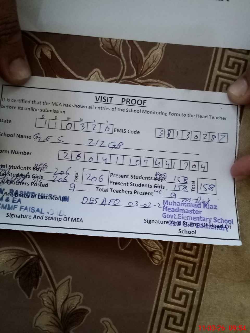 | Attendance Register | Head Teacher | MEA with School | Visit Proof |
