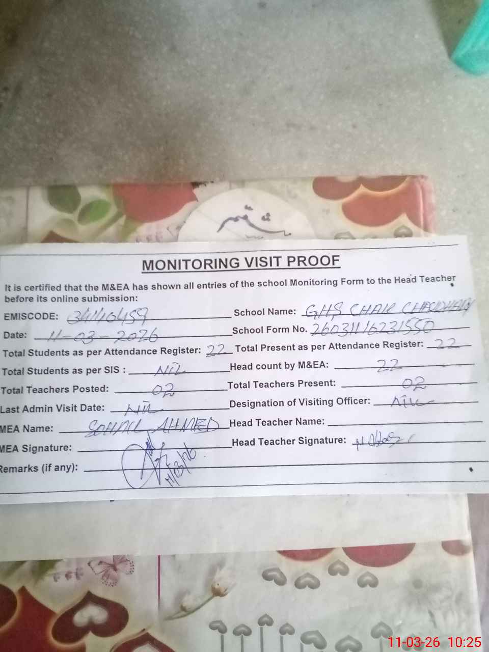 | Attendance Register | Head Teacher | MEA with School | Visit Proof |