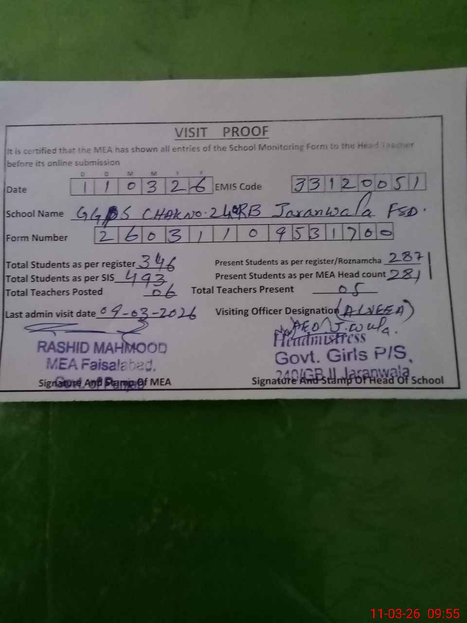 | Attendance Register | Head Teacher | MEA with School | Visit Proof |