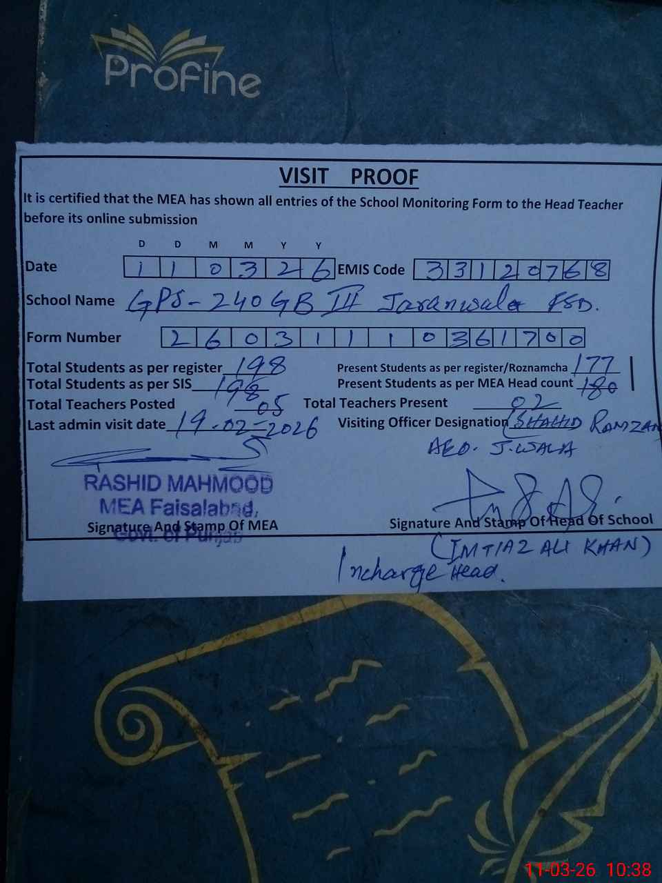 | Attendance Register | Head Teacher | MEA with School | Visit Proof |