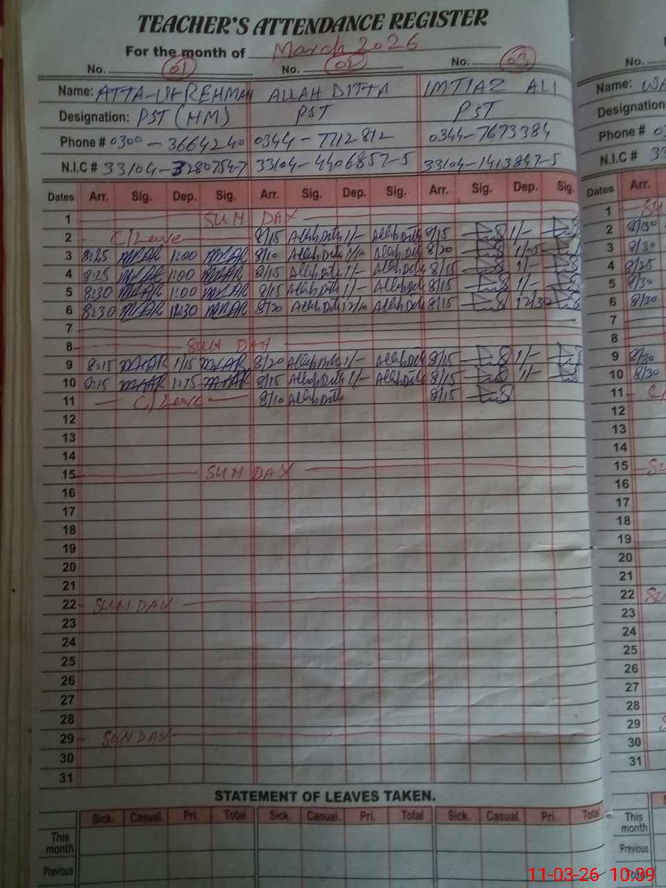 | CNIC | Full Name | Designation | R/C | Absence During Last Calender Month |