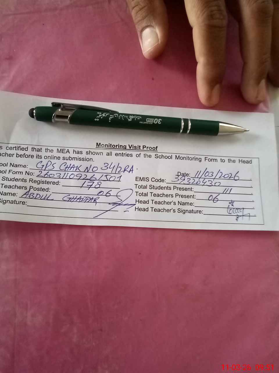 | EMIS Code: 39320430 | Name of School: GPS CHAK NO. 34/ 2-RA | |||