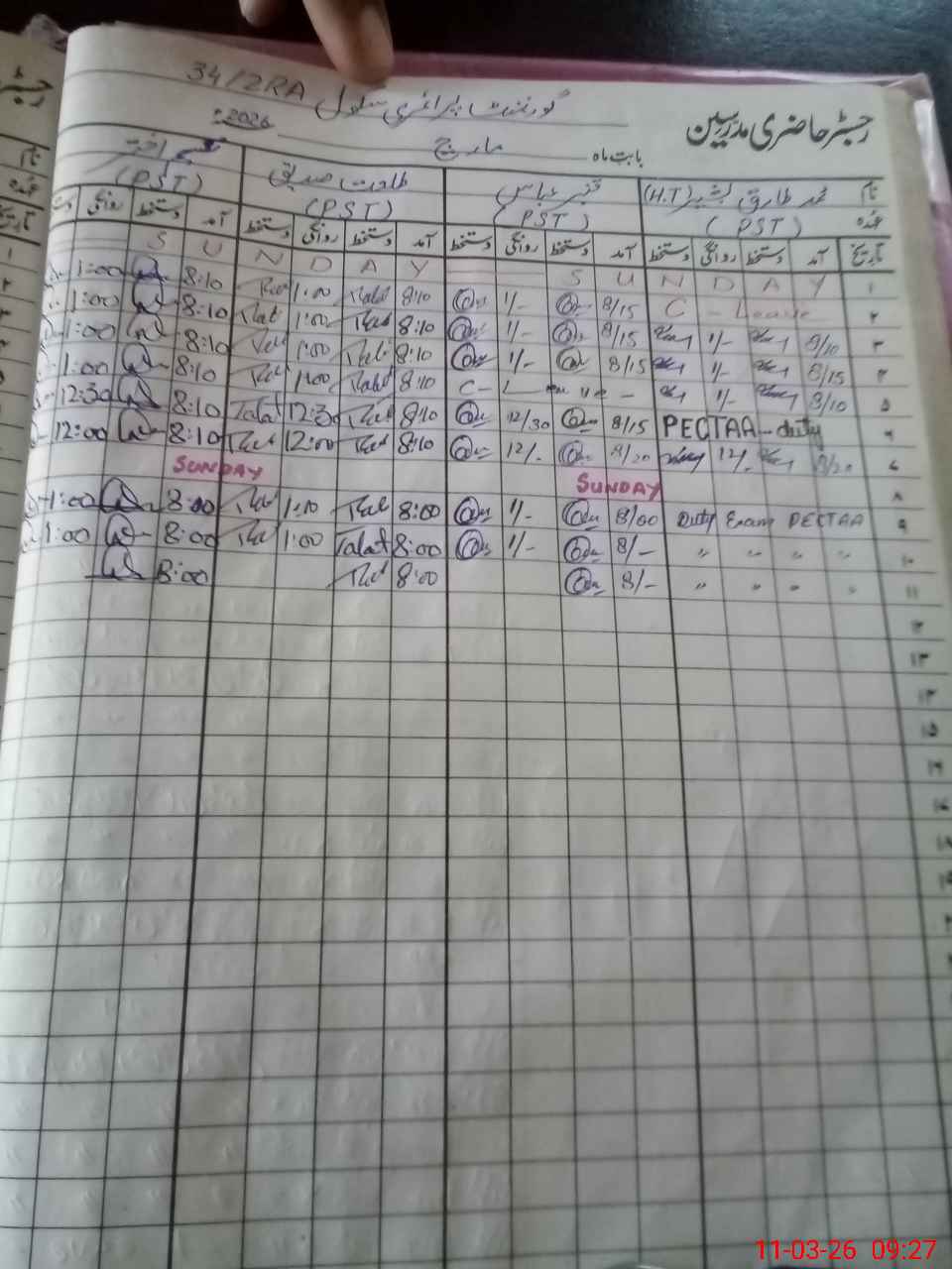 | 35**** | Mu**** Ta**** Ba**** | PST Arts | Regular | 0 | 0 | 0 | 0 | 0 | 0 | 0 | 0 | 0 | Exam Duty |