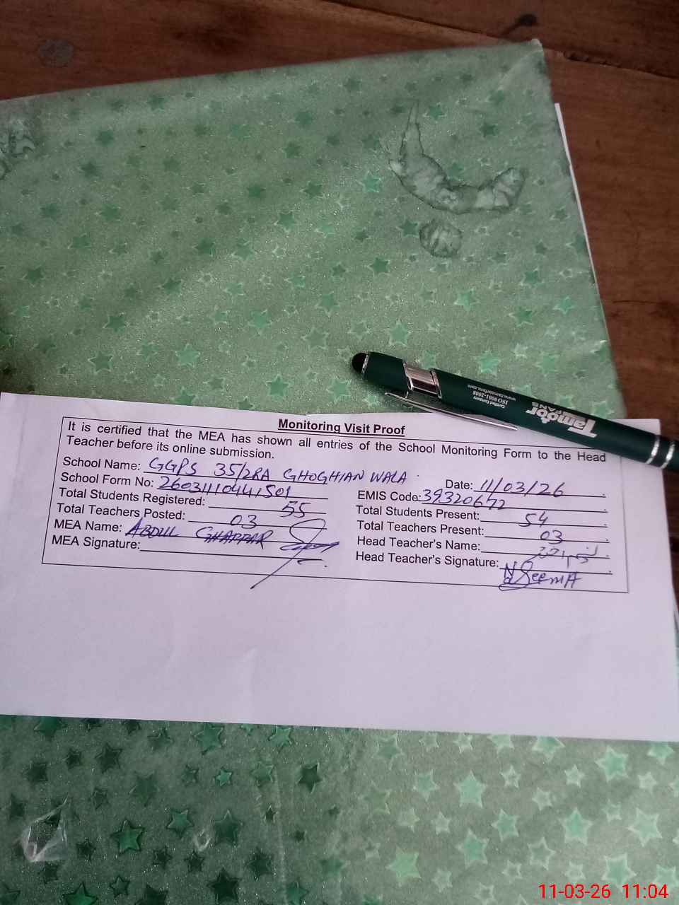 | Attendance Register | Head Teacher | MEA with School | Visit Proof |