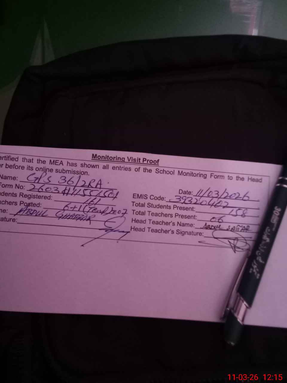 | Attendance Register | Head Teacher | MEA with School | Visit Proof |