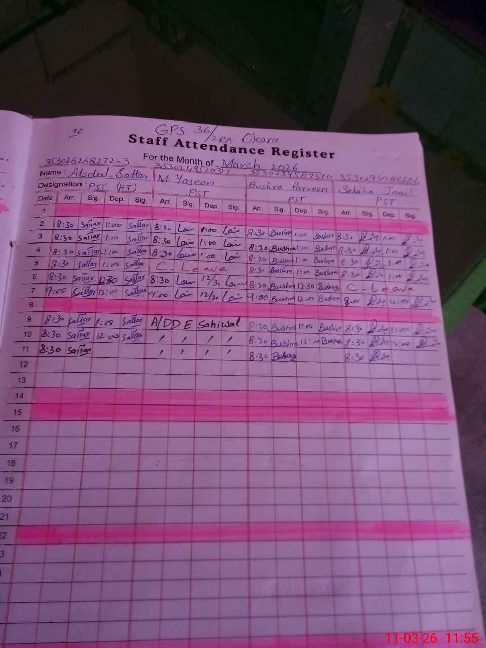 | Remarks (Use Separate Page if Required): 01 male teacher named Muhammad yaseen PST is attached with Divisional Director (EE) Sahiwal Division (On Disposal) | |||||