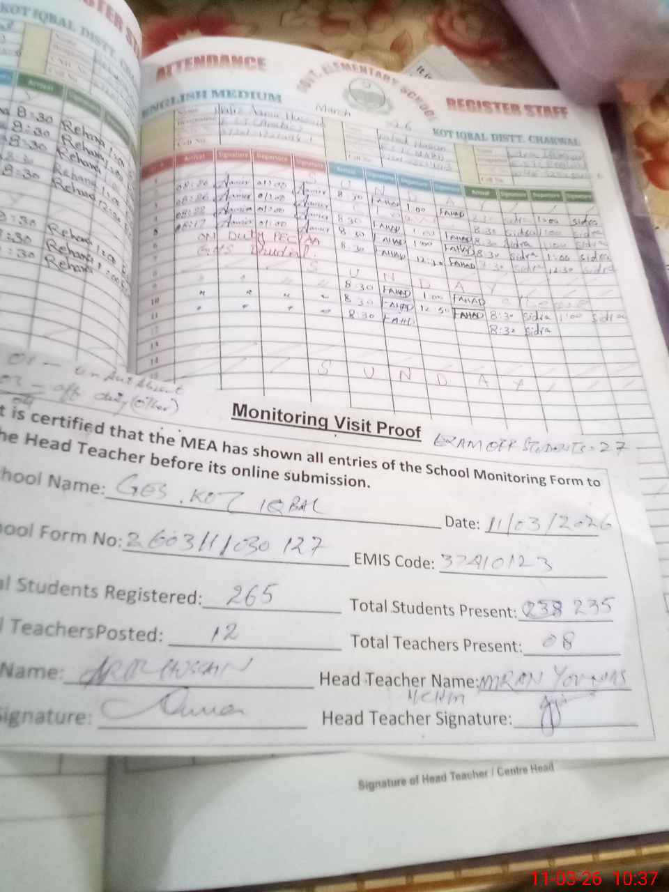 | Attendance Register | Head Teacher | MEA with School | Visit Proof |