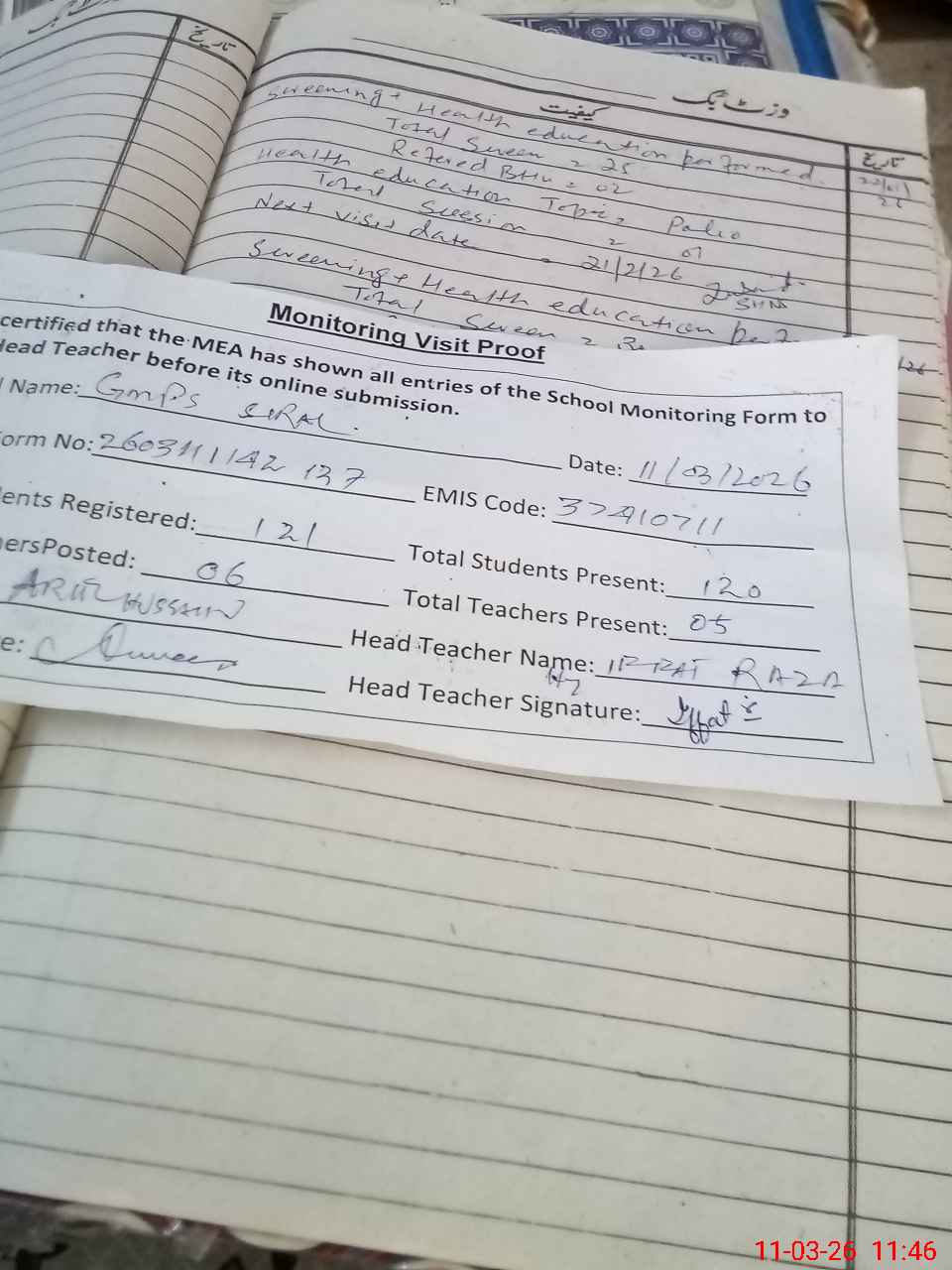 | Attendance Register | Head Teacher | MEA with School | Visit Proof |