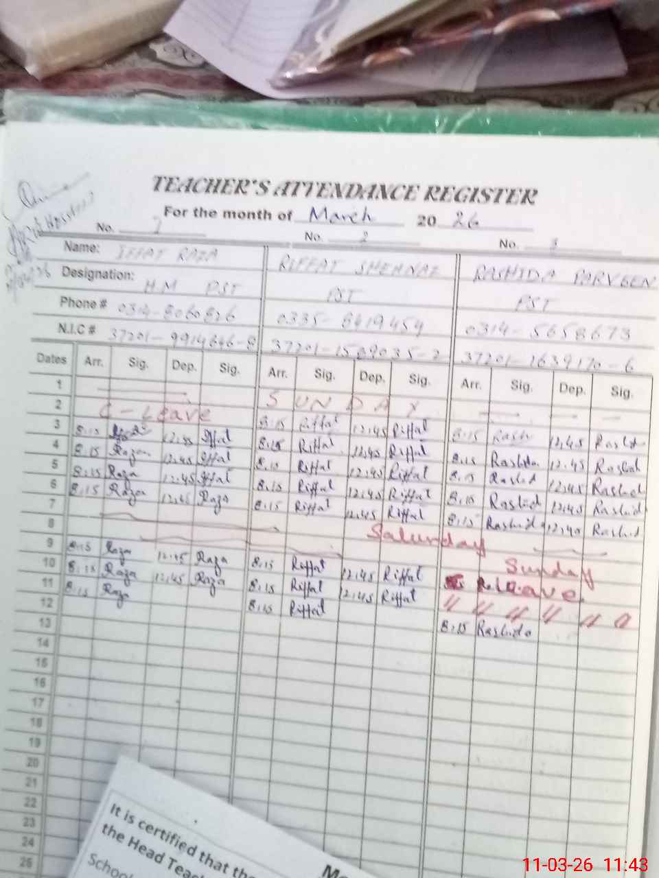 | Name: RI**** RA**** Designation: (School Headmaster's/Headmistress's) Headmistress Phone/Cell Number: 03**** |