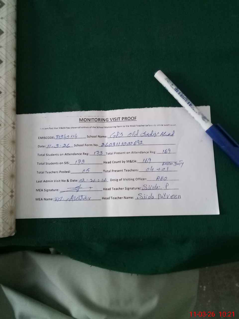 | Monitoring Date: 11-03-2026 | Start Time: 11-03-2026 10:00 AM | End Time: 11-03-2026 10:22 AM | Name of MEA: Mu**** Ak**** | |