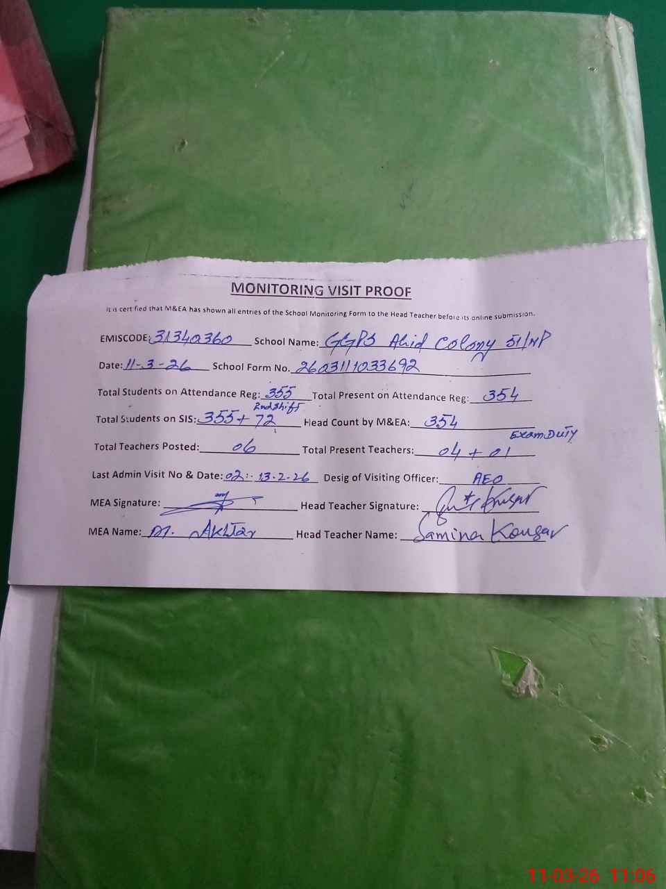 | EMIS Code: 31340360 | Name of School: GGPS ABID COLONY 51 NP | |||