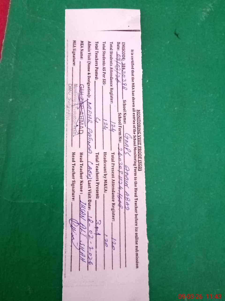 | Attendance Register | Head Teacher | MEA with School | Visit Proof |