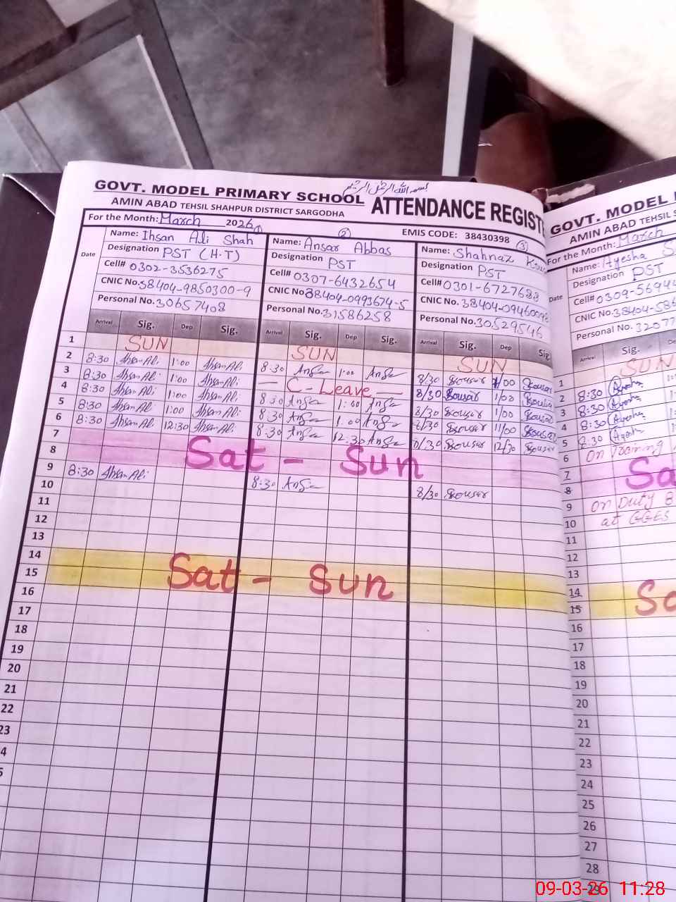 | CNIC | Full Name | Designation | R/C | Absence during last cal. month |