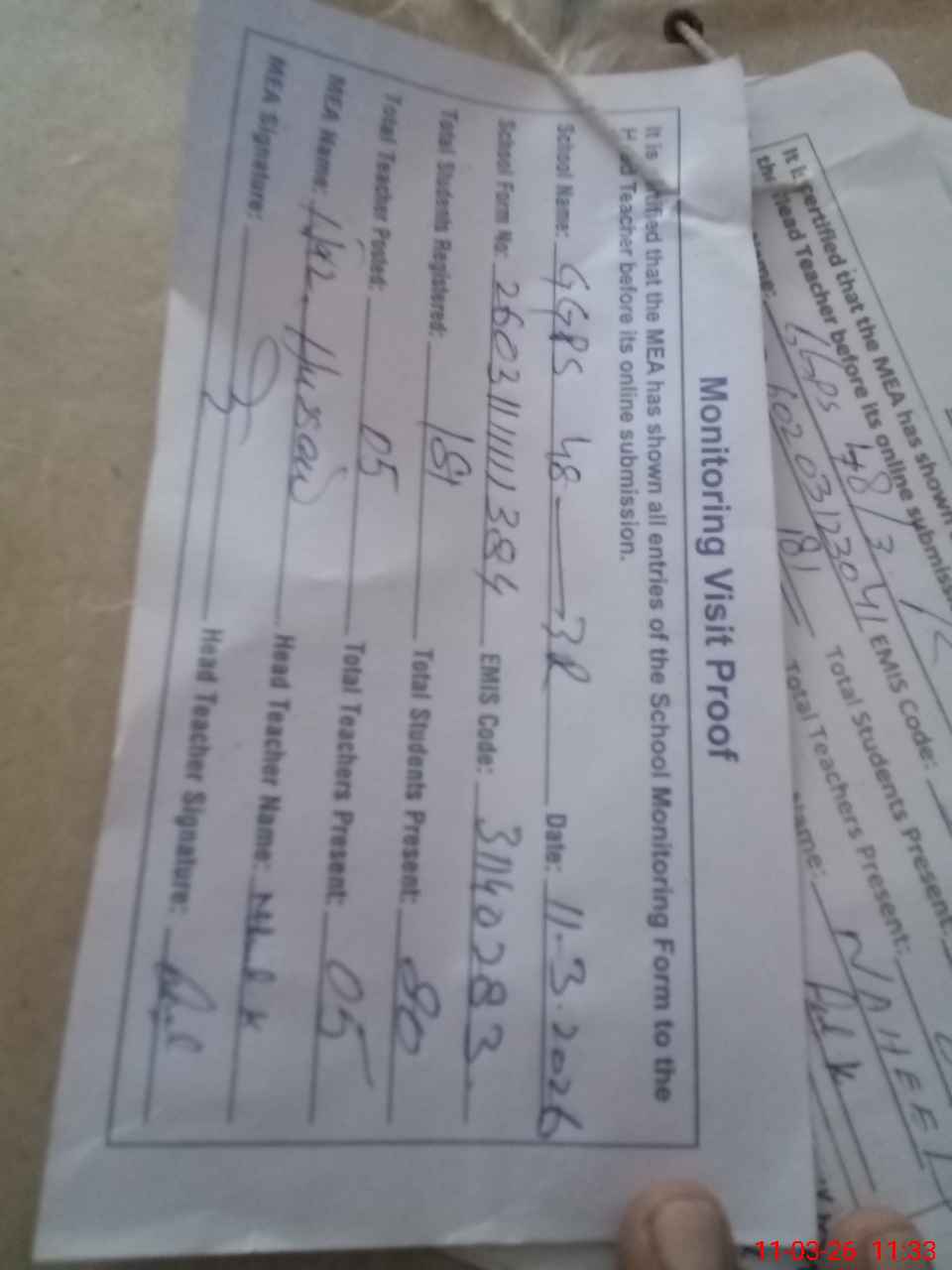 | Attendance Register | Head Teacher | MEA with School | Visit Proof |