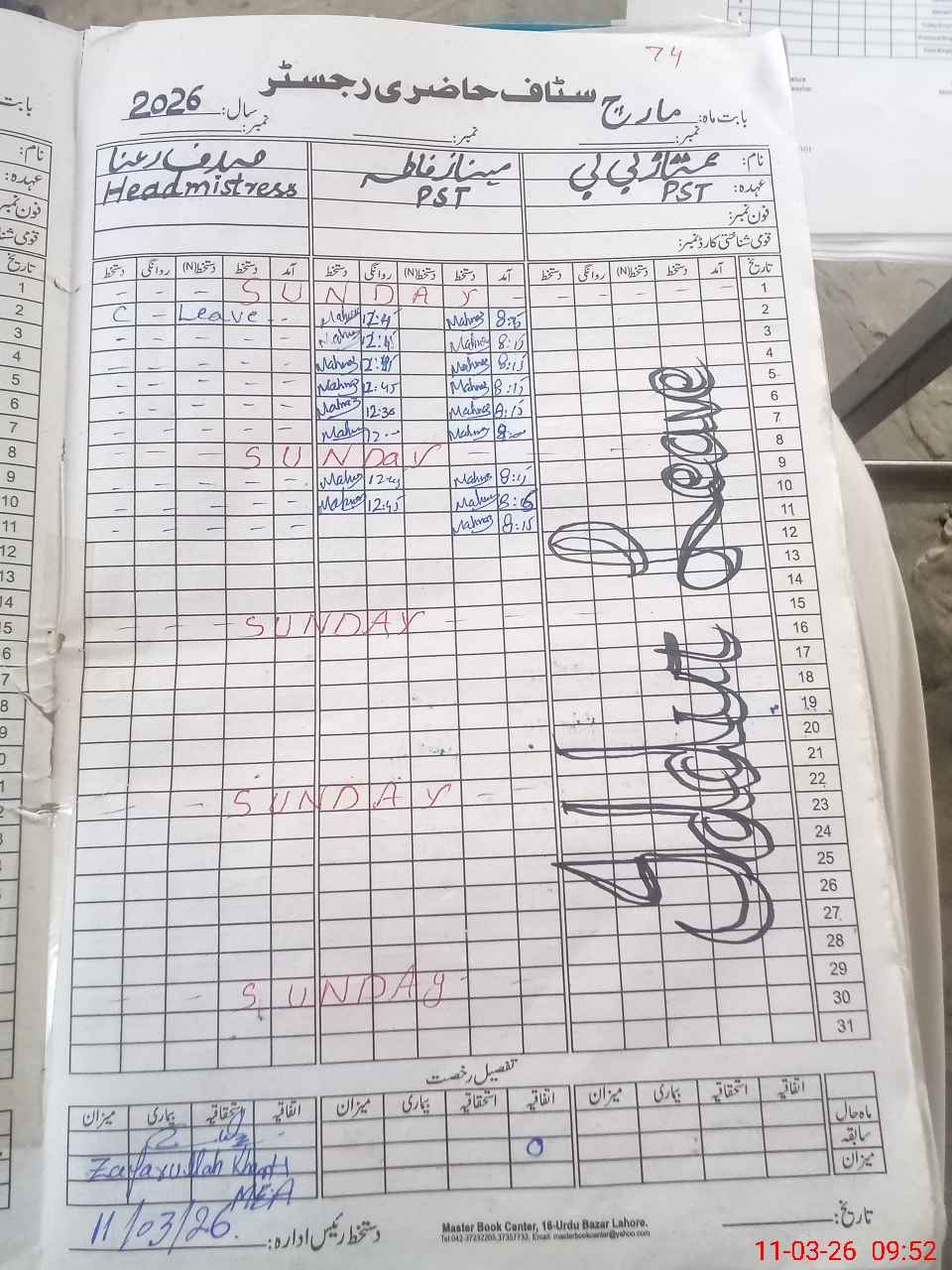 | Total no. of Classrooms: 2 No. of Classrooms Used for Teaching: 2 No. of Classrooms Storing Old Furniture, FTBs, etc: 0Comments if Any: Teacher Mumtaz bibi iddat leave from 16 Feb 26 but not approved till date form d3 and ftf record not available nursery class schedule paper not today |