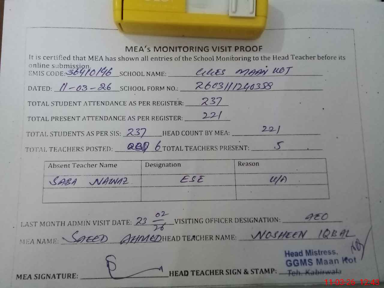 | Attendance Register | Head Teacher | MEA with School | Visit Proof |