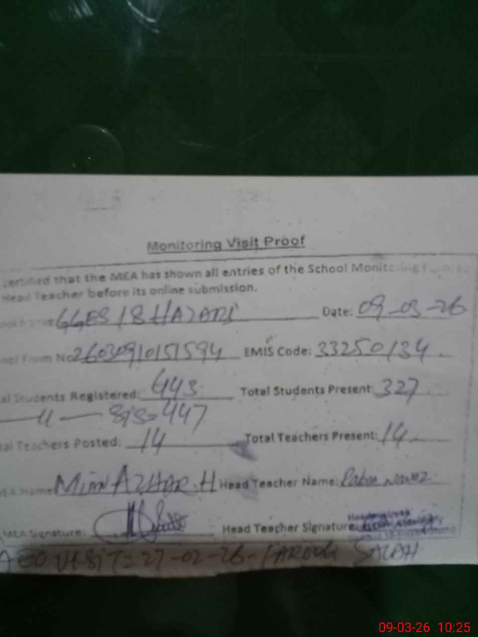 | Attendance Register | Head Teacher | MEA with School | Visit Proof |