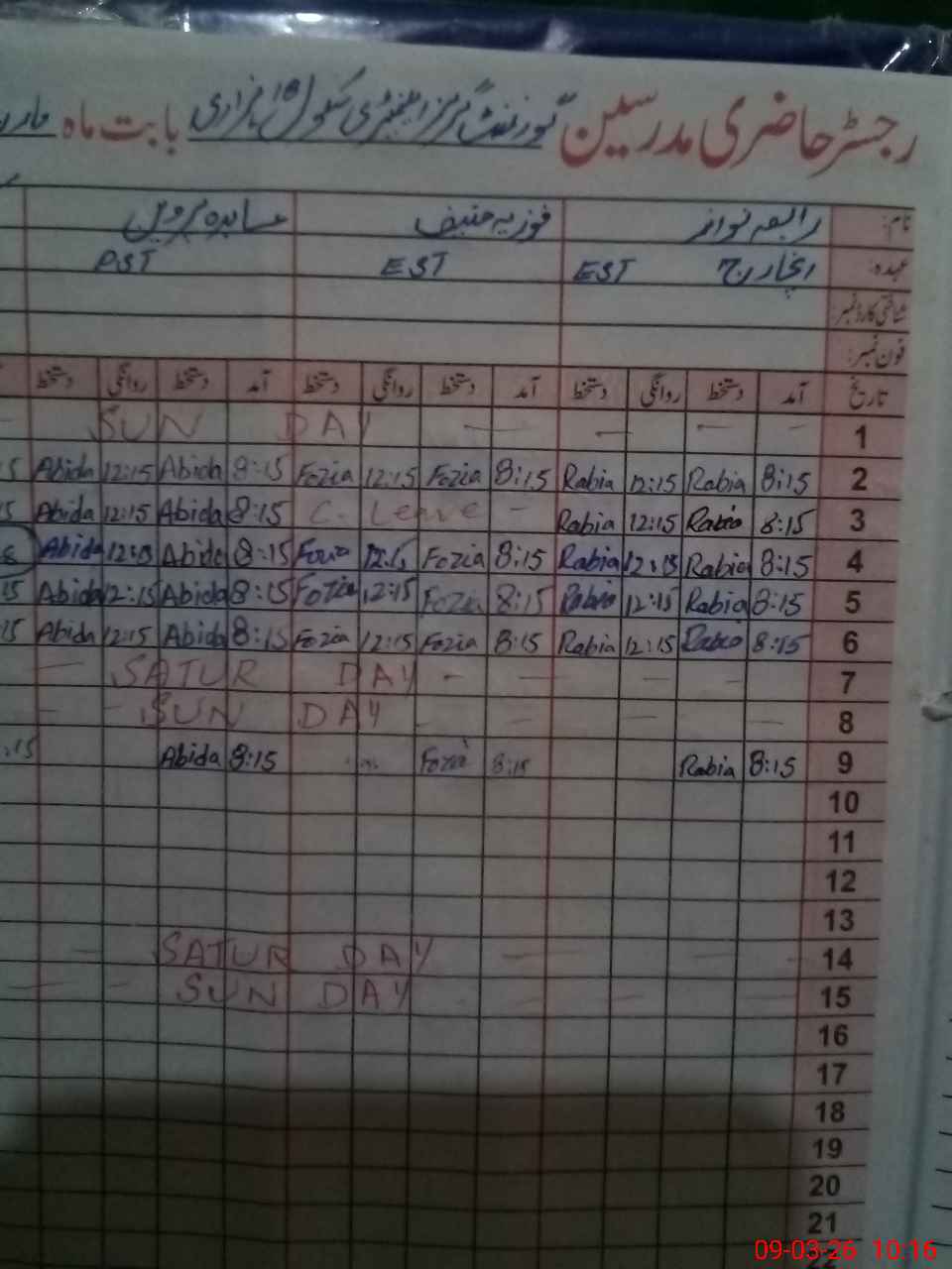 | CNIC | Full Name | Designation | R/C | Absence During Last Calender Month |