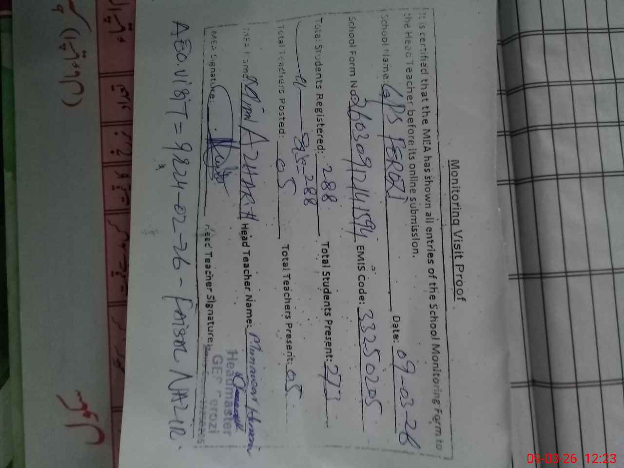 | Attendance Register | Head Teacher | MEA with School | Visit Proof |