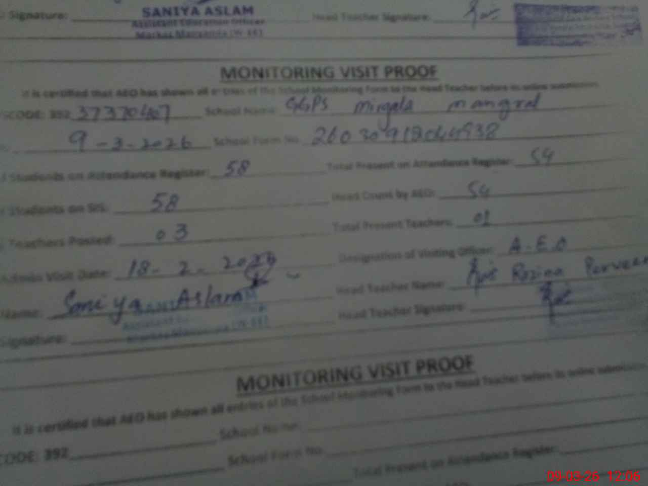 | Attendance Register | Head Teacher | MEA with School | Visit Proof |