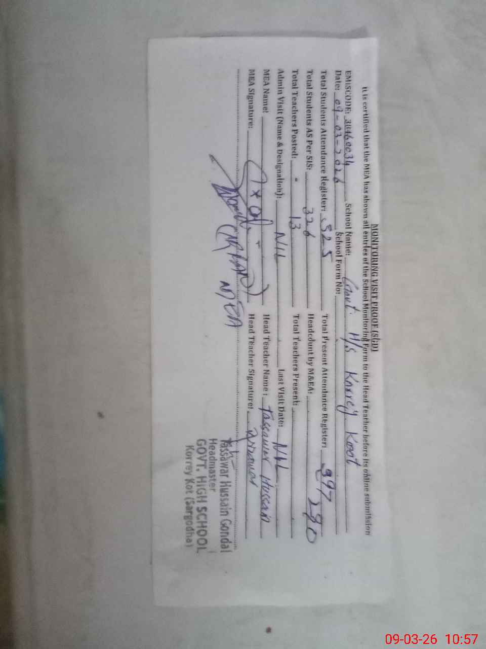 | Attendance Register | Head Teacher | MEA with School | Visit Proof |
