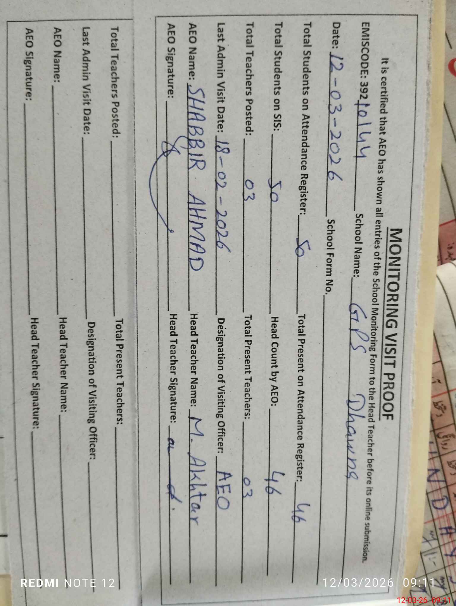 | EMIS Code: 39210144 | Name of School: GPS DHAWANA | |||