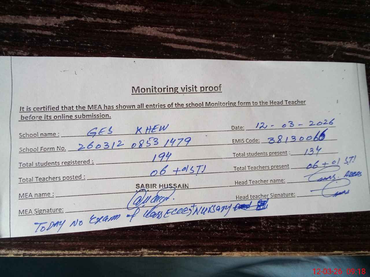 | Attendance Register | Head Teacher | MEA with School | Visit Proof |