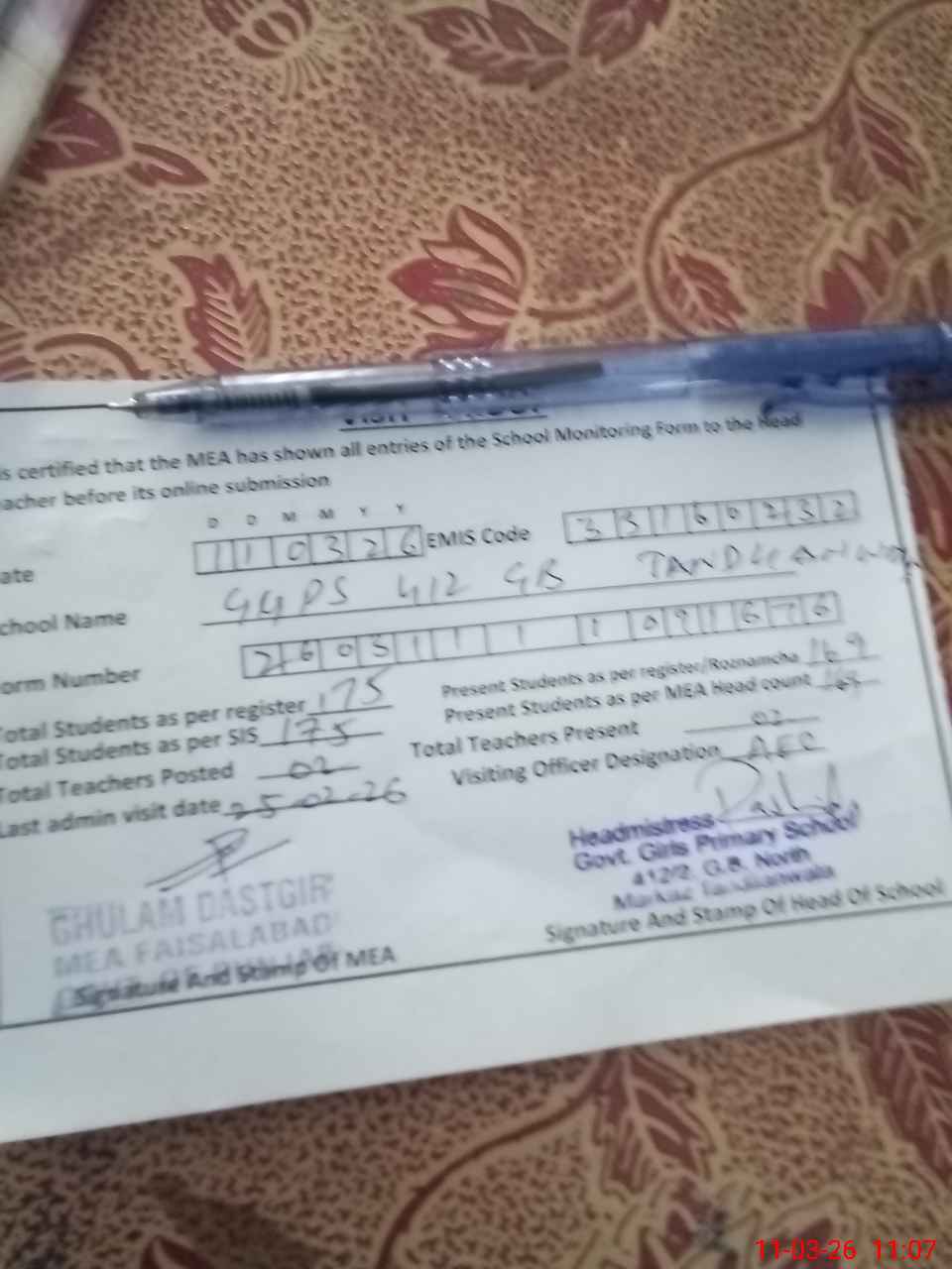 | Certified that this School was Inspected by the Undersigned MEA/DMO Today and the Information Stated Above is as Per Record. | |||||