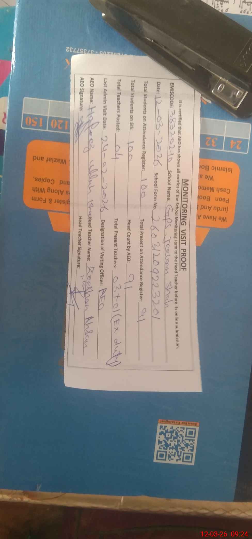 | Attendance Register | Head Teacher | MEA with School | Visit Proof |