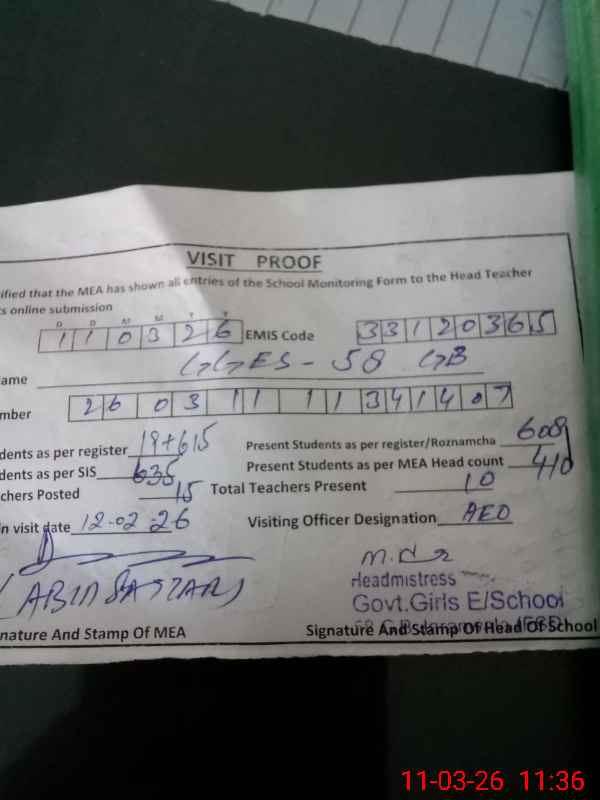 | Certified that this School was Inspected by the Undersigned MEA/DMO Today and the Information Stated Above is as Per Record. | |||||