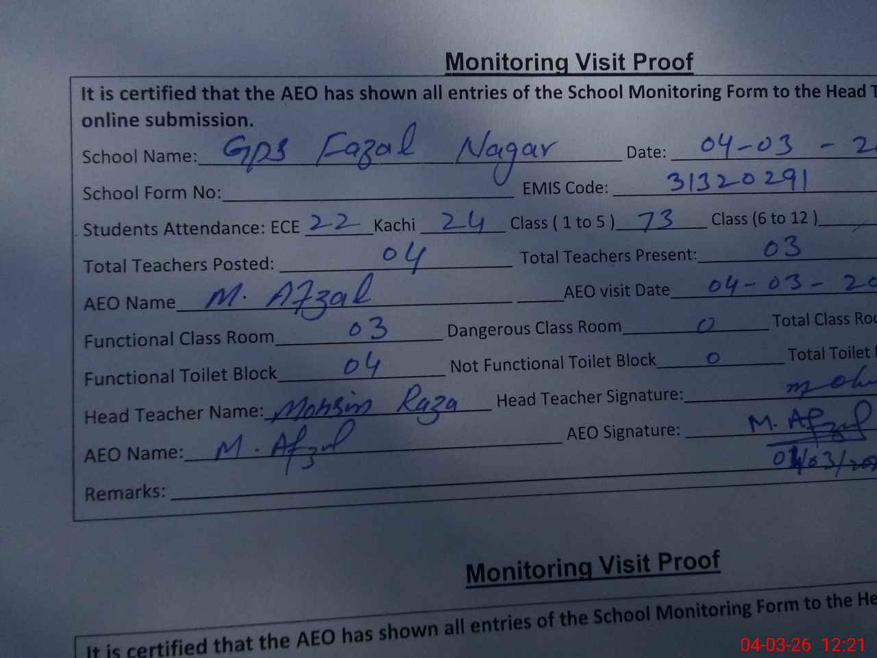 | EMIS Code: 31320291 | Name of School: GPS FAZAL NAGAR | |||
