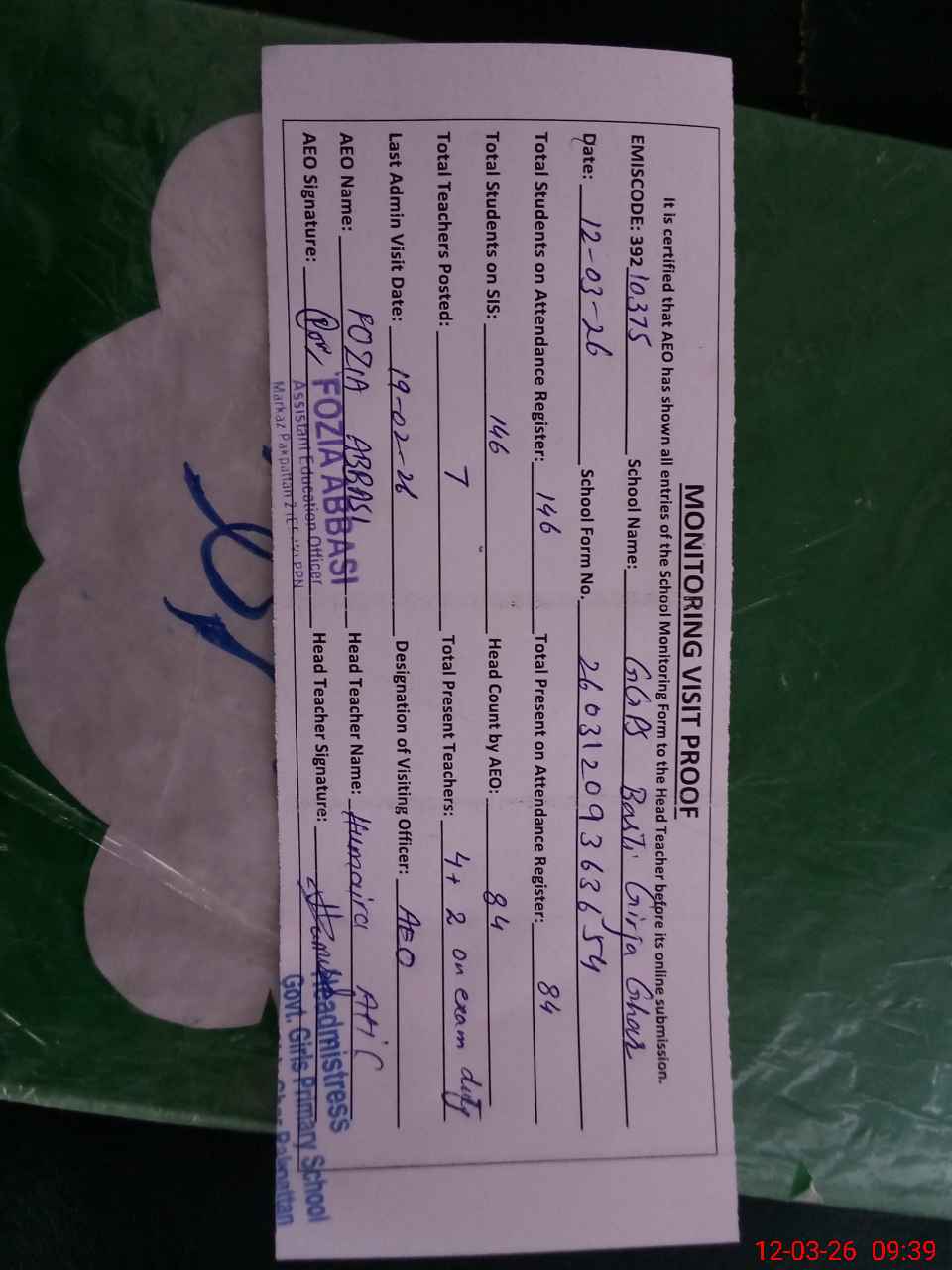 | Certified that this School was Inspected by the Undersigned MEA/DMO Today and the Information Stated Above is as Per Record. | |||||