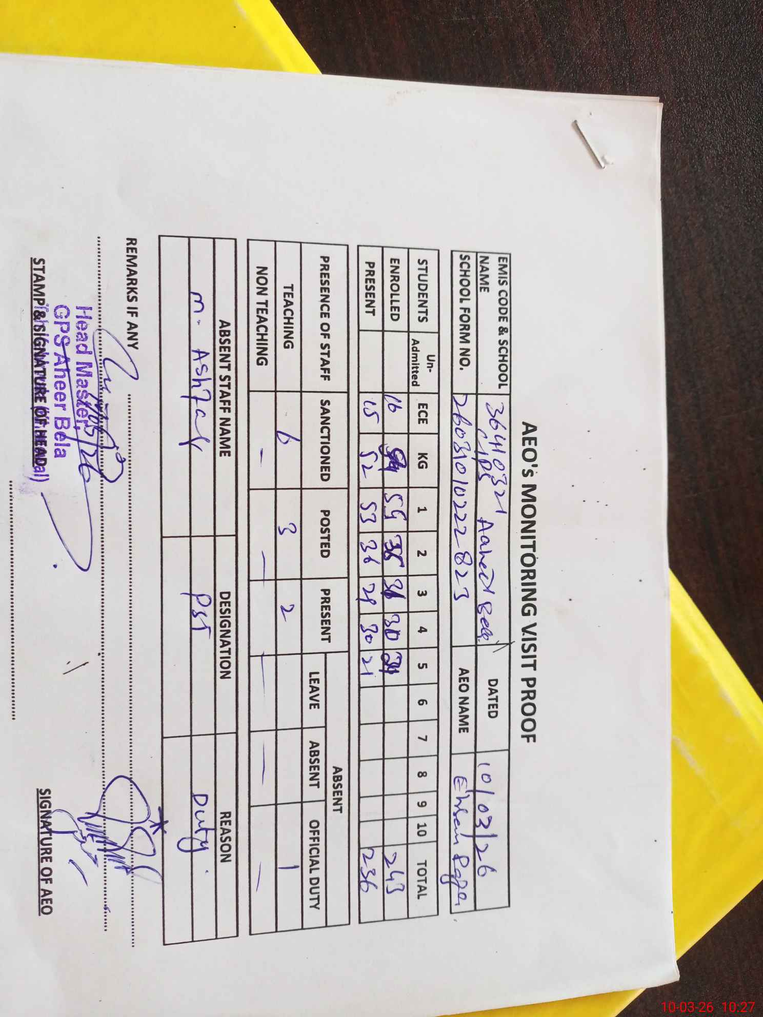 | Attendance Register | Head Teacher | MEA with School | Visit Proof |
