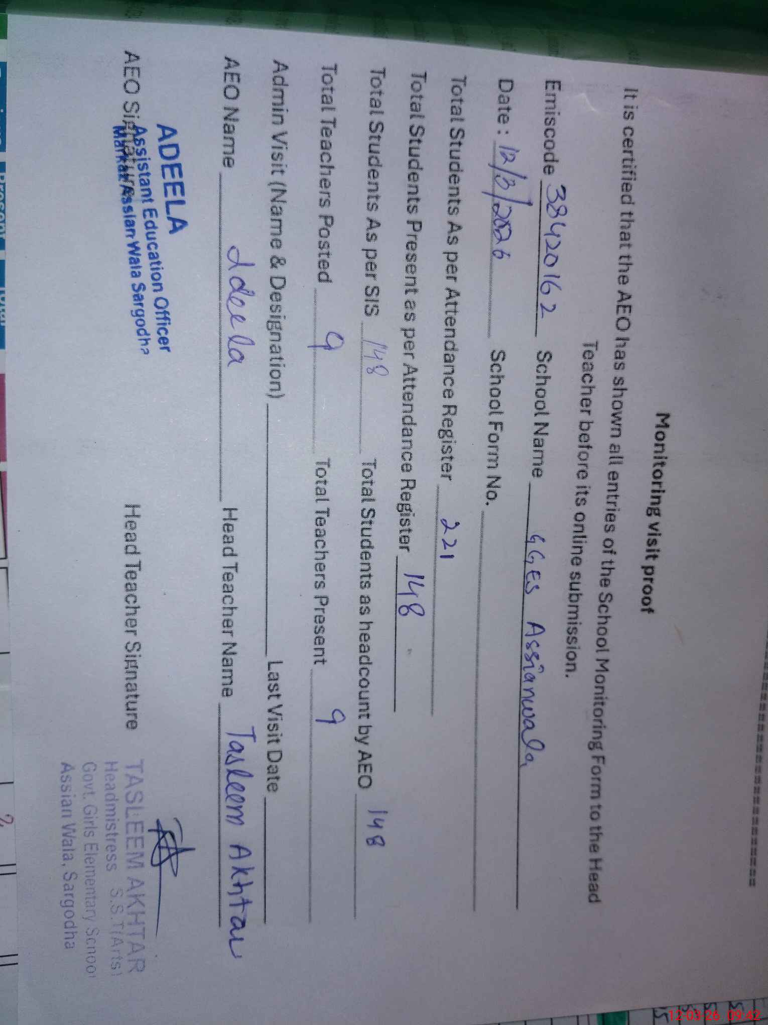 | District: SARGODHA | Tehsil: SARGODHA | Markaz: ASIAN WALA - FEMALE | Level: Middle | |